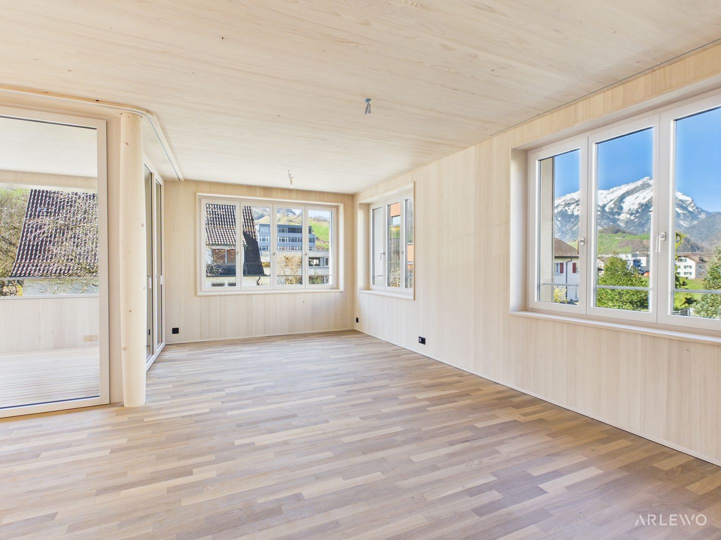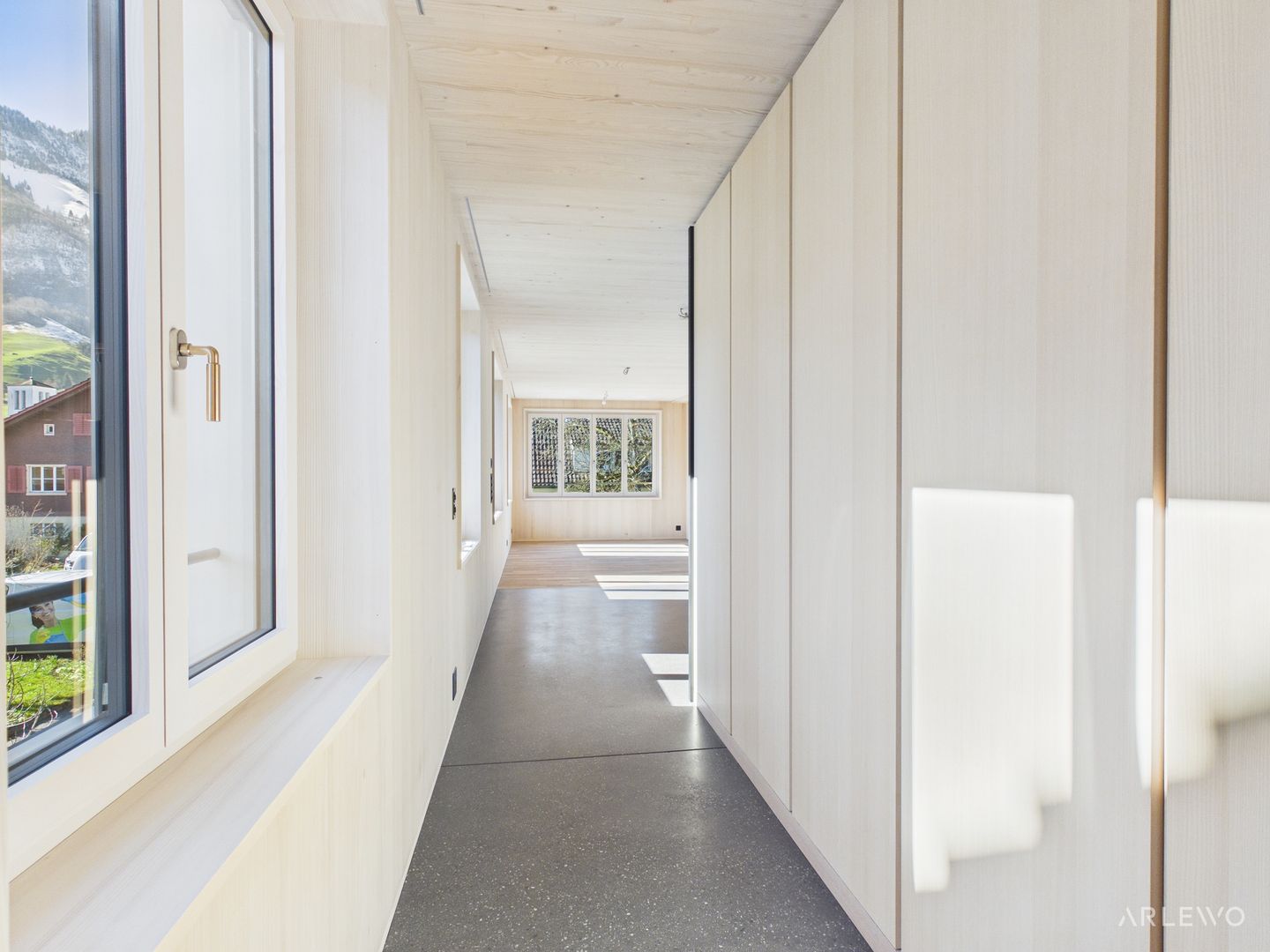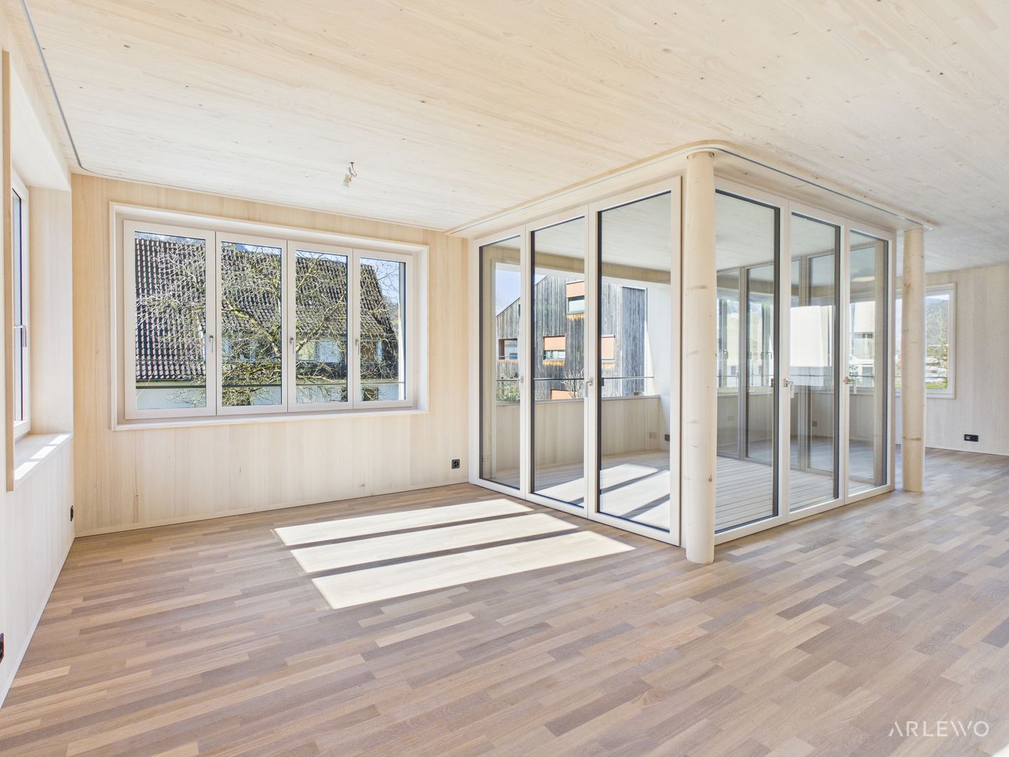 Verarbeitet wurden ausschliesslich hochwertige, natürliche Materialien. Die Aussenwände bestehen aus leimfreiem Massivholz, die Decken aus echtem Vollholz. Lehm- und Kalkputz sorgen für ein angenehmes Raumklima, während Parkett- und Terrazzoböden zeitlose Eleganz mit Pflegeleichtigkeit verbinden.