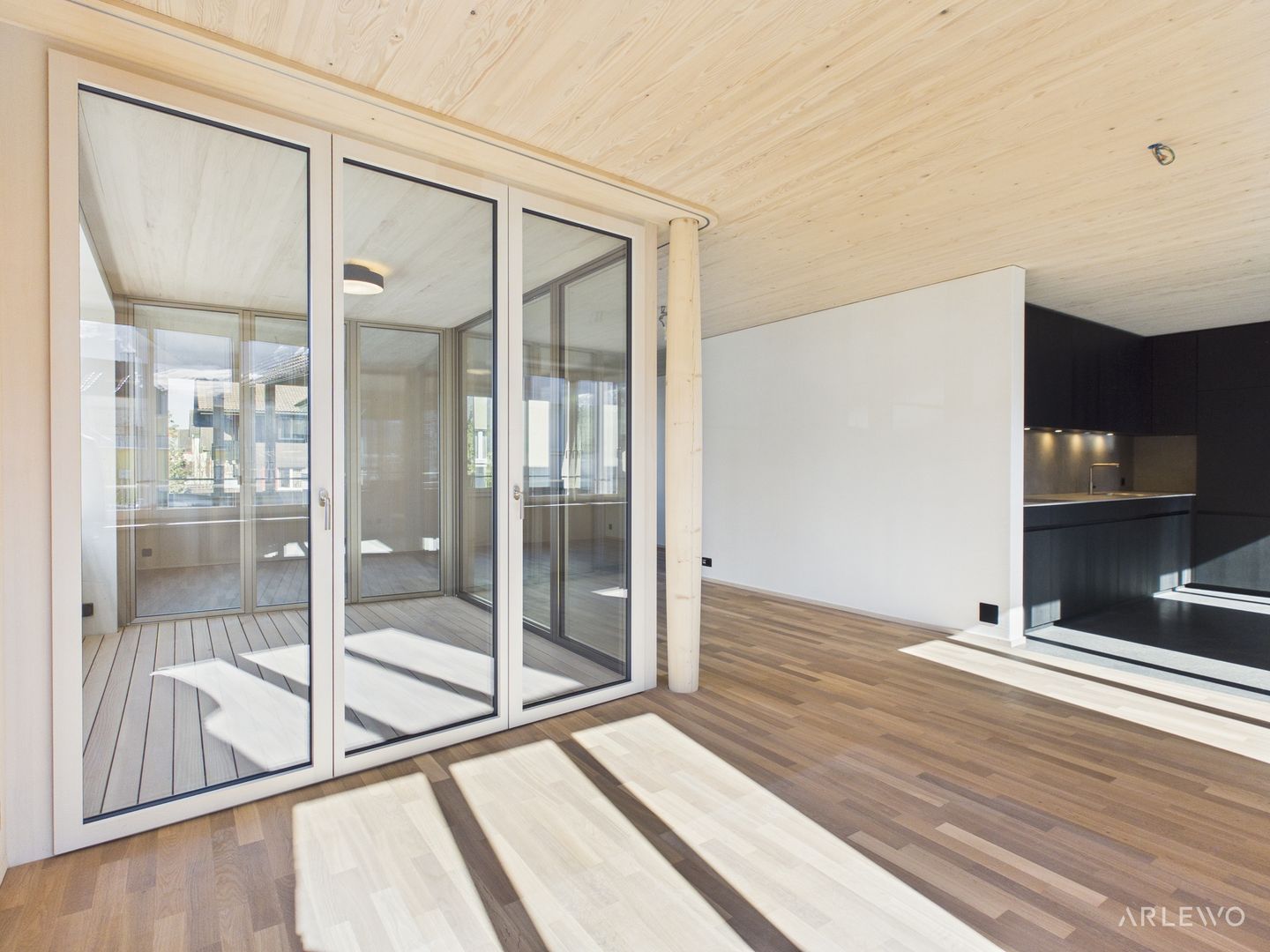 ...von einem hochwertigen Innenausbau, einem attraktiven Raumkonzept, hoher Privatsphäre sowie einem einzigartigen Wohnfühl-Ambiente aus Holz.
