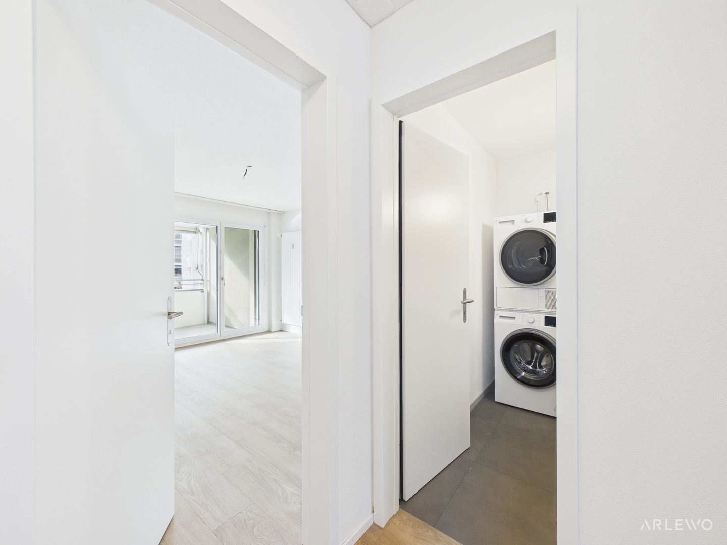 Die 3½-Zimmer-Wohnungen (Typ 8.1) überzeugen durch einen geräumigen, funktional gestalteten Grundriss mit einer Wohnfläche von ca. 77.5 m². Jede Einheit verfügt über zwei Balkone mit Ausrichtung nach Westen und Osten. Wohn- und Schlafbereiche sind mit einem Vinylboden in Parkettoptik ausgestattet. In Badezimmer und Dusche kommen pflegeleichte Feinsteinzeugplatten zum Einsatz. Die Waschtische verfügen über Unterbaumöbel sowie einen Spiegelschrank mit integrierter Beleuchtung und Doppelsteckdose. Die grosszügige Dusche mit Regenduschkopf ist durch eine Glastrennwand mit Schiebefunktion abgetrennt. Der private Waschturm befindet sich im wohnungsinternen Reduit.